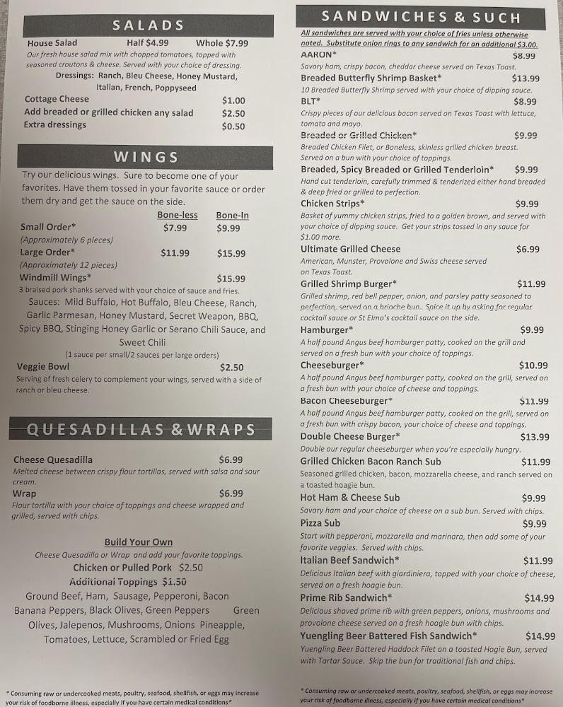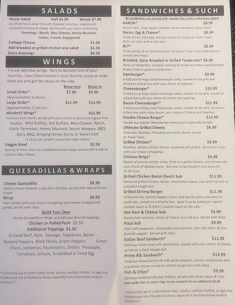 The Windmill Tavern offers a diverse menu that blends traditional American favorites with local flair. Starters include favorites like fried pickles and jalapeño poppers, perfect for sharing. Main dishes feature hearty burgers, breaded tenderloin sandwiches, and crispy chicken strips. Desserts like chocolate chip cookie pie add a sweet ending.