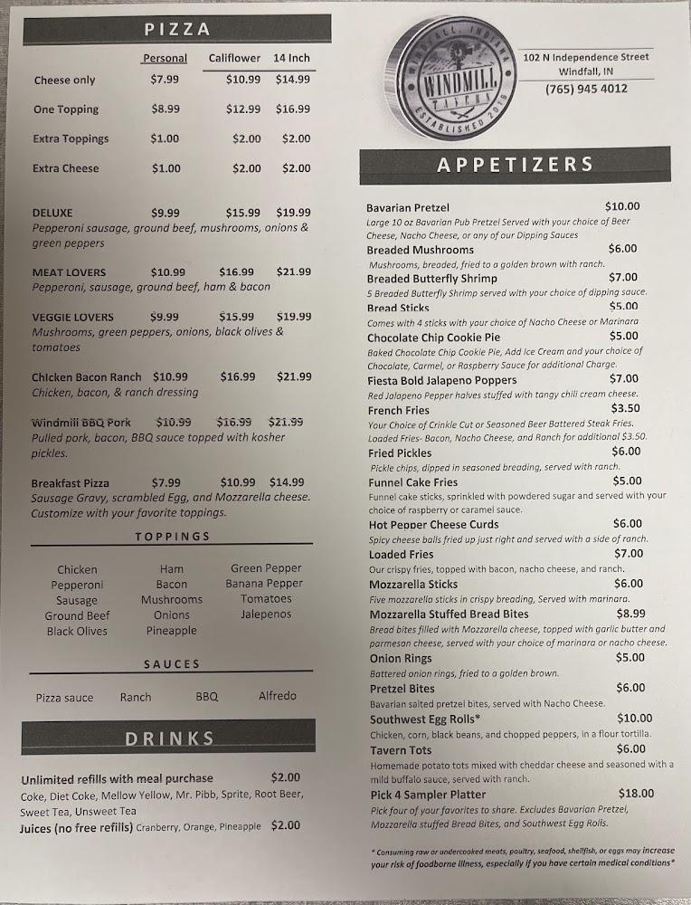 Welcome to The Windmill Tavern, your go-to spot in Windfall, IN, for a delightful mix of American cuisine and a vibrant bar scene. Located at 102 N Independence St, this cozy eatery offers a relaxed atmosphere with excellent cocktails, a fantastic beer selection, and regular live music events. Enjoy mouthwatering grill specialties and traditional dishes, perfect for lunch or dinner, whether dining solo or with friends. The tavern features accessible amenities, making it welcoming for everyone. With karaoke nights, sports screenings, and a space to dance, The Windmill Tavern is the ideal place to unwind and have fun!